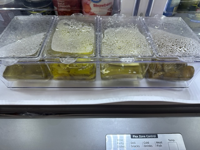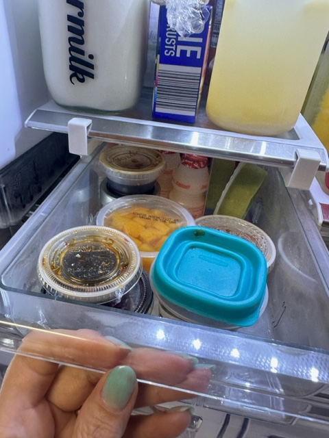 I also dumped 4 of our most used condiments into a condiment tray that we now keep in the fridge. It’s easy to take out and simply set on the table or counter when it’s time to eat! There went another 4 jars out of the fridge! Admittedly, we are still working on whittling down the amount of condiments in our fridge.