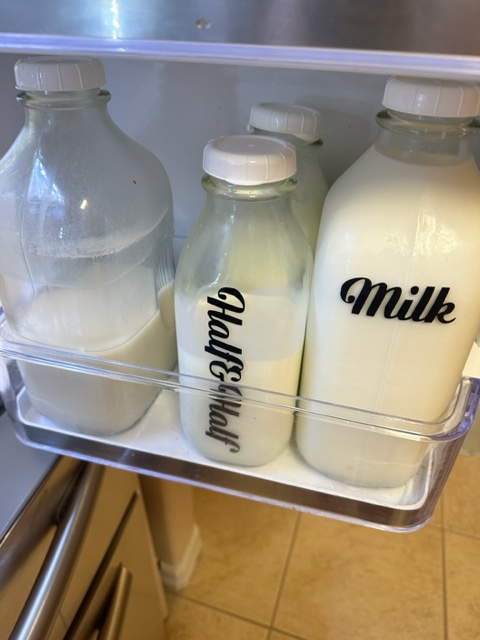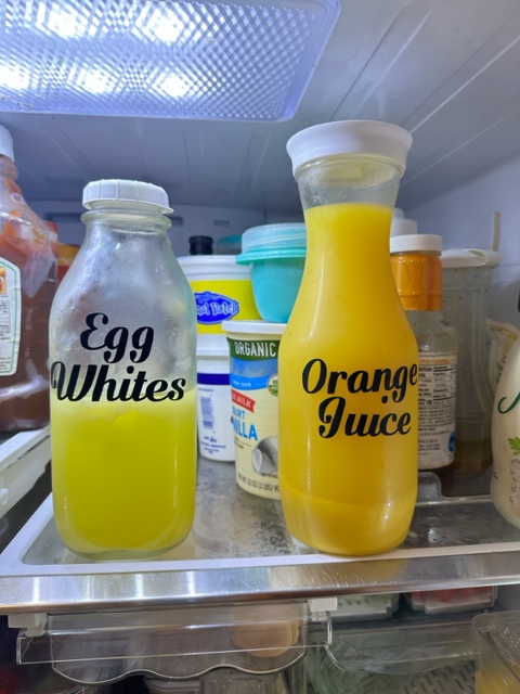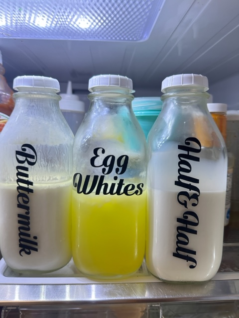 I also chose to switch juices into Carafe’s and dairy into Glass Milk Containers. Now I make up Frappuccino in a carafe with leftover coffee, as well as tea and fruit infused waters too. You can label the glass containers with the expiration date using a dry erase markers. How cool is that?