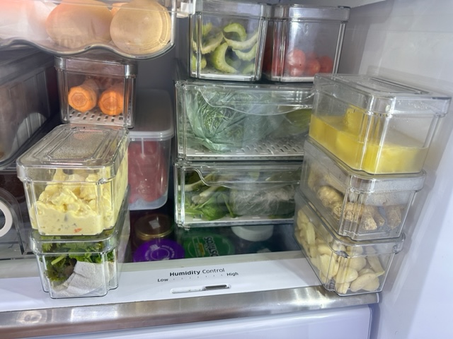 When my order arrived, I got to work. One important thing was to remove the packaging from most of the fruits and vegetables. I replaced all of the fruits and vegetables into the clean, clear containers I bought. Here’s a look at the progress and the containers I bought below.