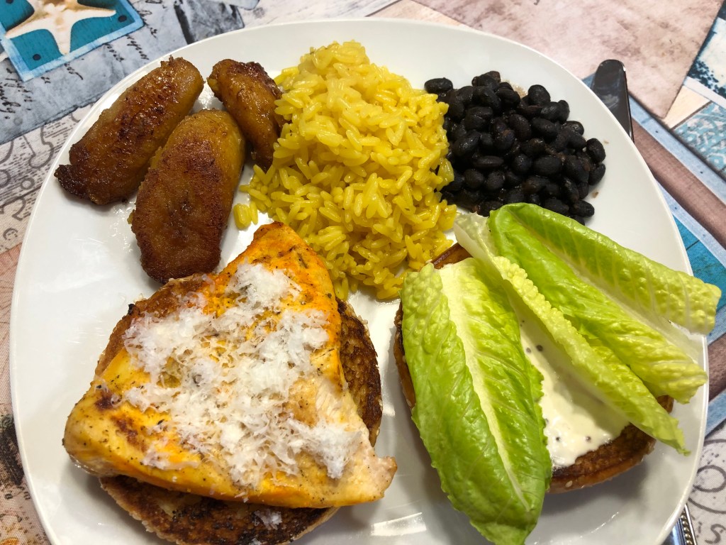 This dinner was served with yellow rice, black beans and sautéed plantains.