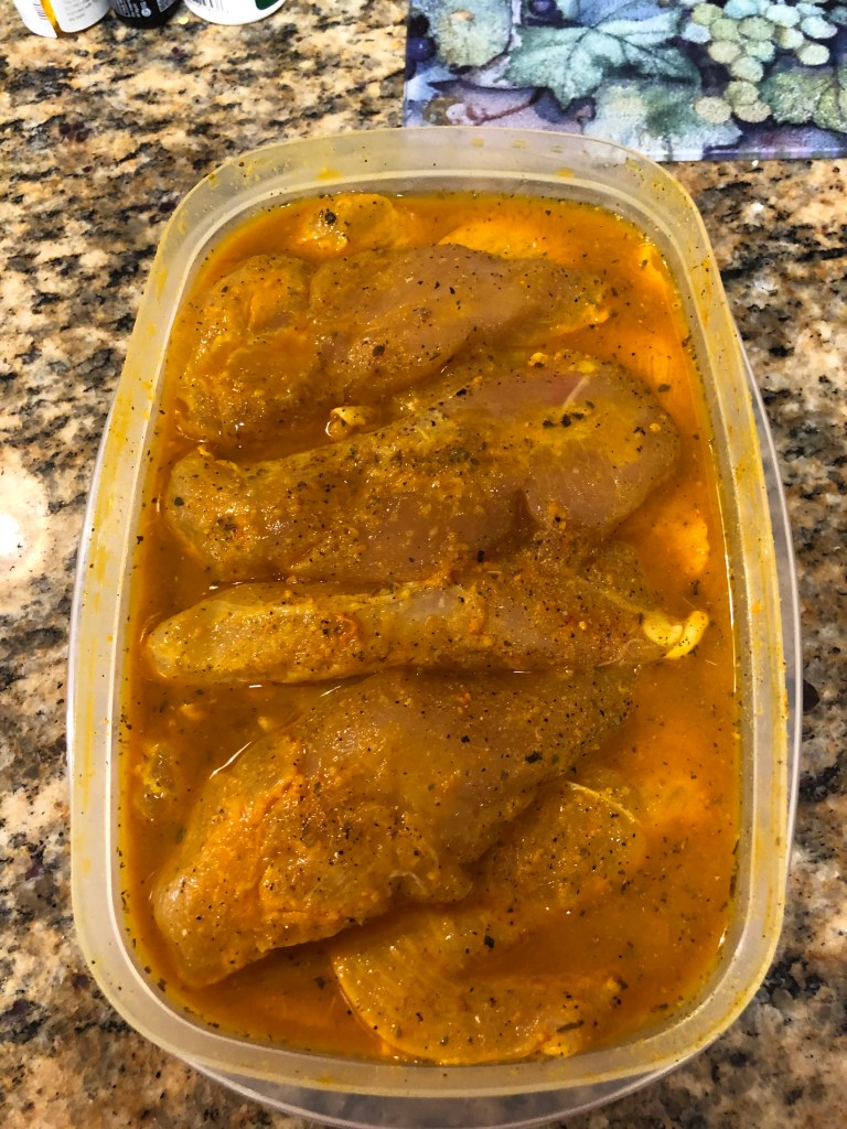 Mix all ingredients into a large bowl. Add chicken and mix to coat chicken. Put in a shallow dish and cover with a lid or plastic wrap. Place dish in the fridge and allow the chicken to marinate for at least 4 hours.